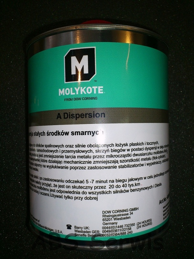 Wytwarza powłokę/film ochronny którego zaletą jest to, że nie ulega przemieszczeniom i pozostaje na tłoku-cylindrze, działając w charakterze awaryjnego smarowania i działa również w czasie, gdy smarowanie hydrodynamiczne nie zostało w pełni uformowane lub zniszczone z jakiegokolwiek powodu (np.przy rozruchu silnika). Molykote A spowoduje , że silnik ma znacznie dłuższą żywotność przy braku właściwego smarowania. Zakres temperatur Molykote A dyspersji waha się w zależności od oleju, do którego dodano produkt.